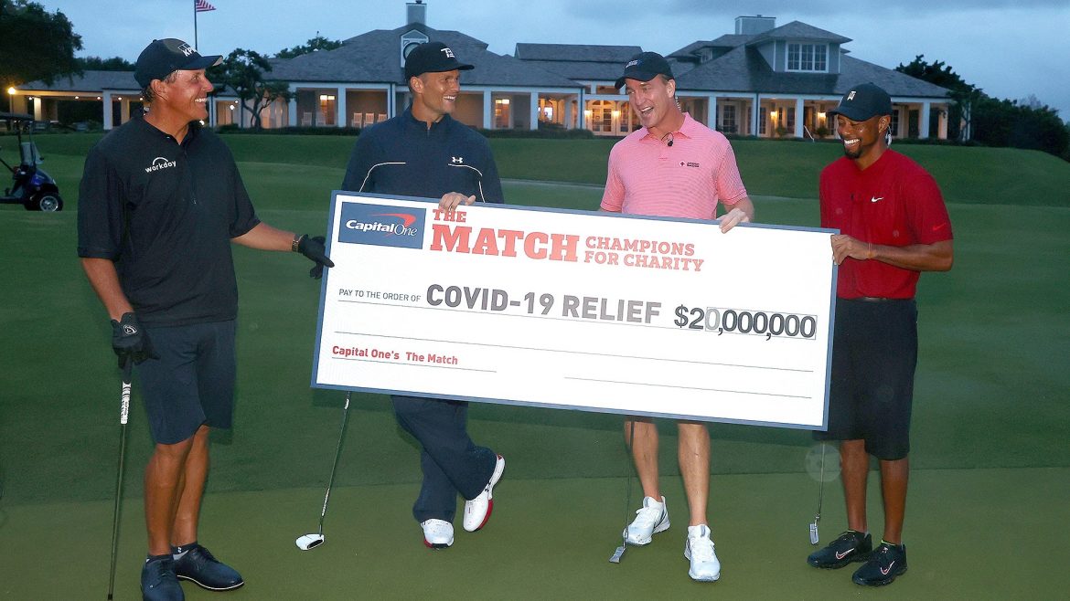 The weather did not cooperate, but that was about the only thing that went wrong Sunday during The Match: Champions for. As Phil Mickelson,Tom Brady, Peyton Manning and Tiger Woods held an oversized cardboard check with a total of $20 million written in, they were soaking wet but smiling.